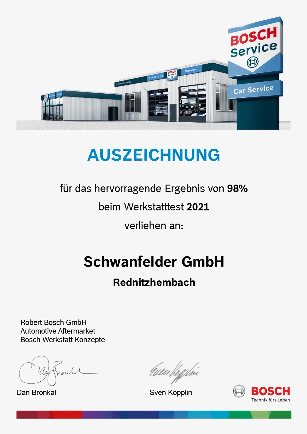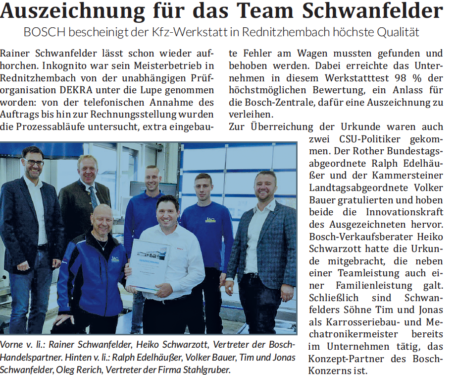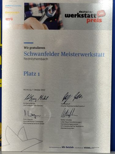 Schwanfelder hatte als Gewinner die Jury mit einem Serviceangebot überzeugt, das jeden Autofahrer in jeder Situation anspricht. Sei es mit Smart-Repair-Angeboten oder aufwendigen Karosserie- und Lackarbeiten, einem Abschleppdienst oder einer SB-Tankstelle sowie dem großzügigen Waschpark auf dem Betriebsgelände. Und selbstverständlich zählen auch klassische Reparatur- und Wartungsarbeiten zum Portfolio der freien Werkstatt.