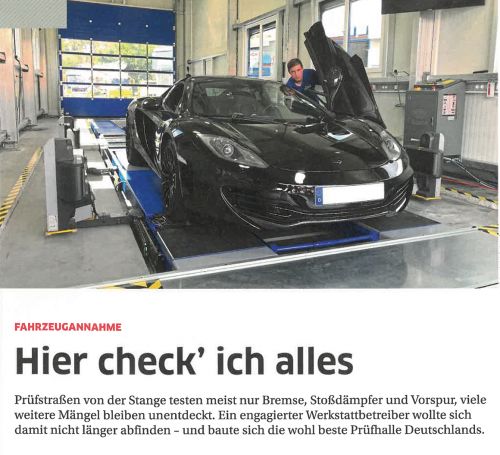 Hier ist die selbstentwickelte und gebaute Mess- und Prüfstraße ein absolutes Highlight und Alleinstellungsmerkmal, das der Betrieb zur Fahrzeugannahme nutzt. Hier wird jedes Kundenfahrzeug binnen 15 Minuten und mit technischer Unterstützung auf Herz und Nieren überprüft. Hintereinander erfassen dann ein Reifenscanner, ein Bremsenprüfstand, der Stoßdämpfertester, eine berührungslose Vermessung, der Scheinwerfereinstellplatz und der Kalibierplatz für Fahrerassistenzsystem sowie ein Abgastester den Zustand des Fahrzeugs, damit möglichst kein Mangel unentdeckt bleibt.